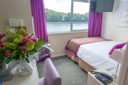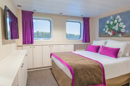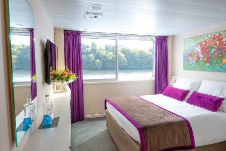 Camarote amplio y cómodo con cama grande separable, baño (lavabo, ducha y aseo privados, toallas incluidas), secador, televisión, caja fuerte y radio. Situado en el puente intermedio con ventanas altas correderas, ofrece una vista panorámica del paisaje.
