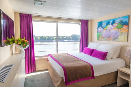 Camarote amplio y cómodo con balcón francés y ventanal corredero, cama grande, baño (lavabo, ducha y aseo privados, toallas incluidas), secador, televisión, caja fuerte y radio. Situado en el puente superior con balcón francés conventanas panorámicas correderas, ofrece una vista panorámica del paisaje.
