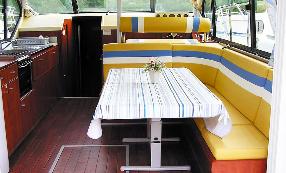 Su amplio comedor da acceso directo, mediante una puerta corredera, a la terraza trasera, lo cual garantiza un salón muy amplio, perfecto para los grupos más grandes. El mobiliario de jardín y el toldo son ideales para comer al aire libre, mientras que el segundo puesto de pilotaje permite al capitán disfrutar del sol en la azotea solarium: ¡todo ventajas para garantizar el éxito del crucero fluvial!