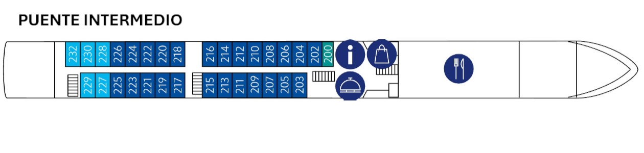 Las cabinas están decoradas con un estilo moderno y acogedor, y cuentan con climatización regulable de forma individual, ducha y WC, televisión vía satélite, teléfono, secador de pelo y caja fuerte.