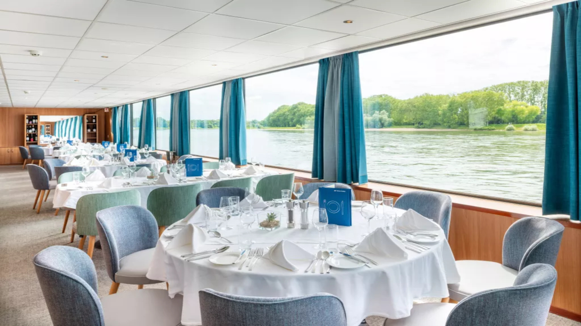 En la cubierta superior, todas las cabinas ofrecen ventanales panorámicos de suelo a techo que se abren, creando un elegante balcón francés sobre el río.