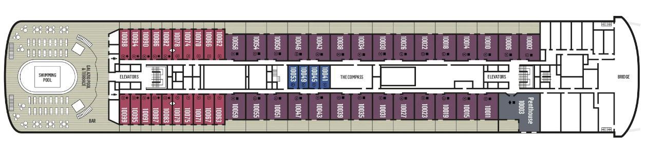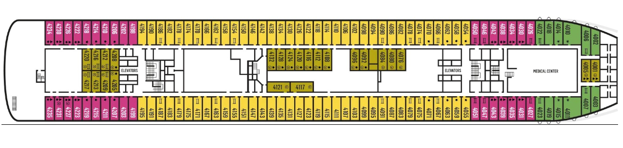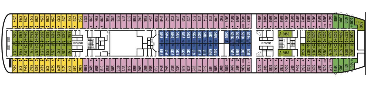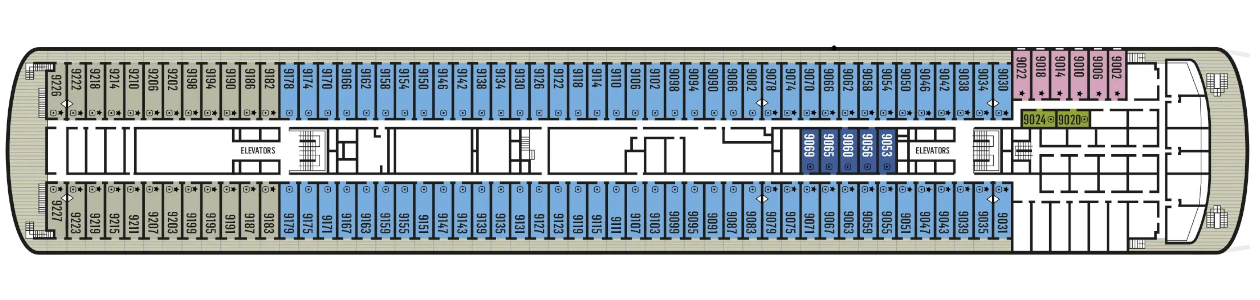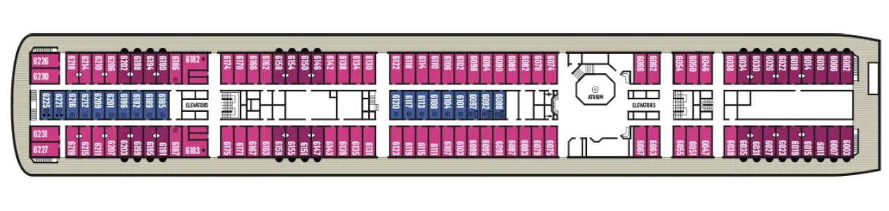 Donde se encuentran todos los camarotes y suites con diferentes comodidades según la categoría elegida.