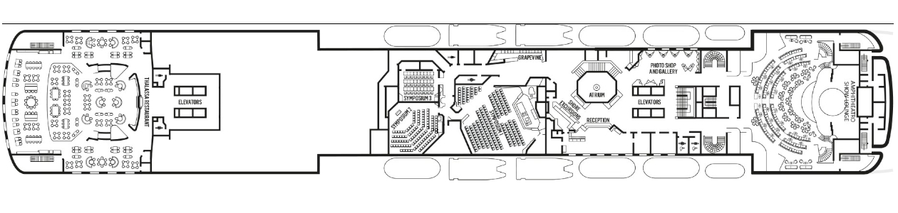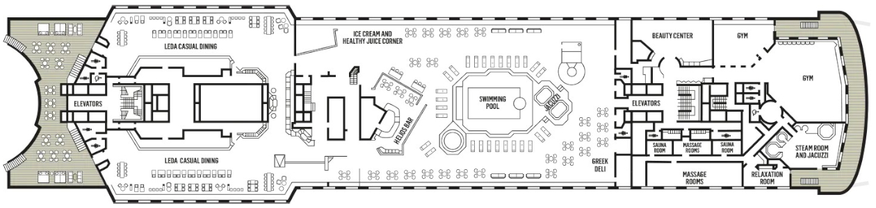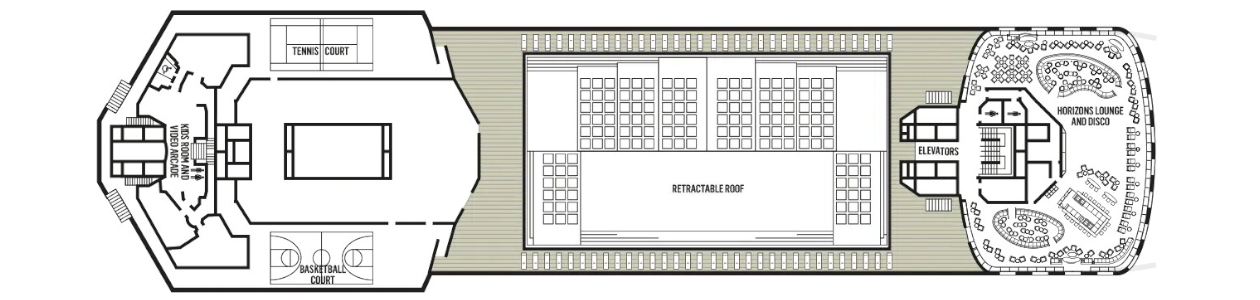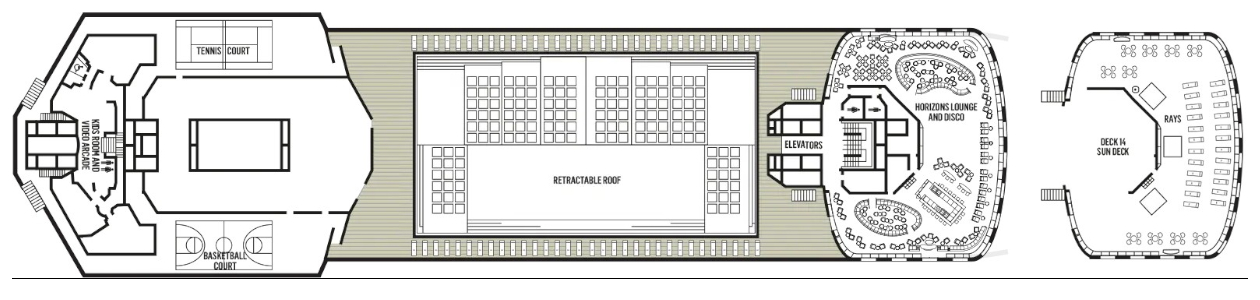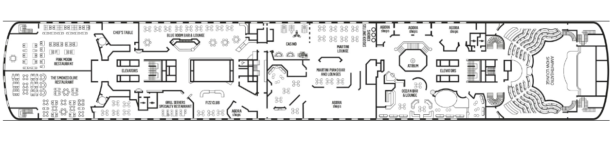 Incluye restaurantes, bares y salones, el teatro Ampitheatre Show Lounge, casino y zonas para actividades y espectáculos.