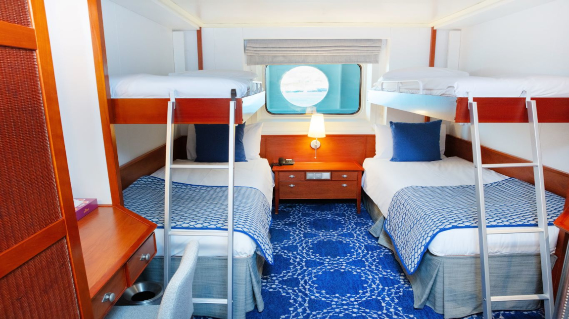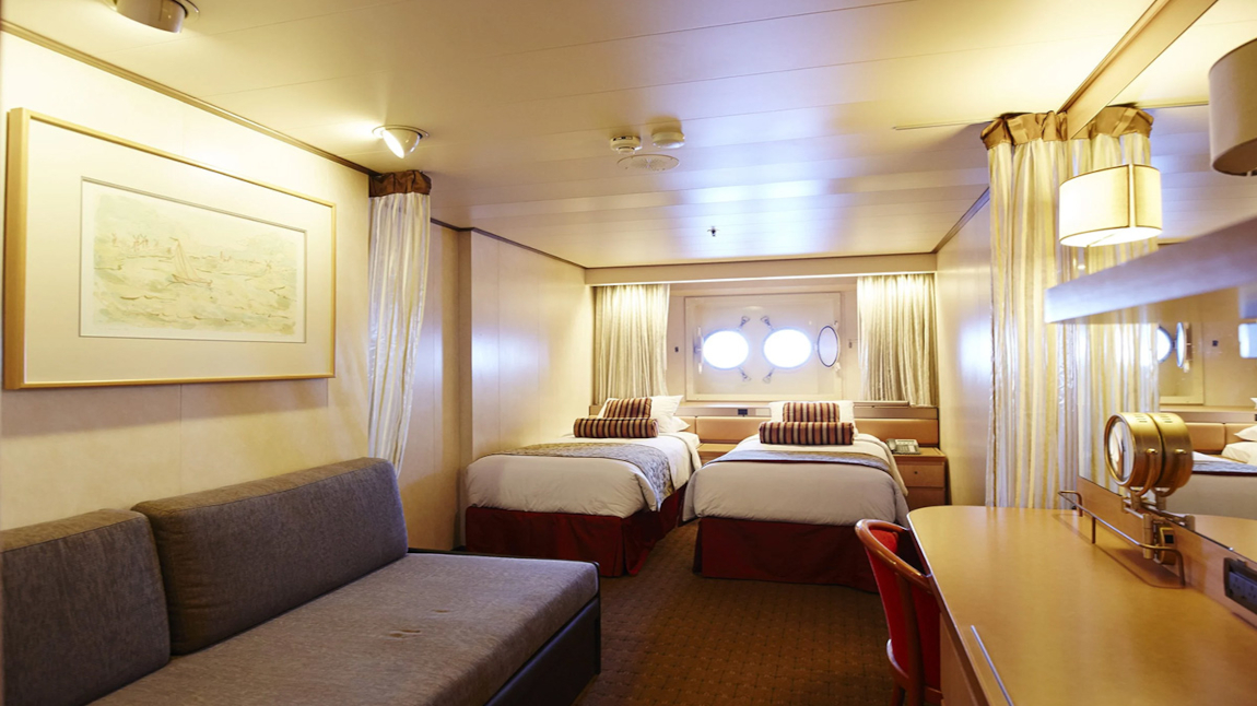 Camarote exterior con ventana, vista mar. Cuenta con dos camas inferiores y una cama superior y una litera individual o doble con sofá cama. También dispone de baño con bañera o ducha, teléfono, secador de pelo, caja fuerte y televisor. Las camas individuales se pueden juntar bajo petición. Televisor, teléfono y caja fuerte. Cuarto de baño con ducha o bañera y secador de pelo.19