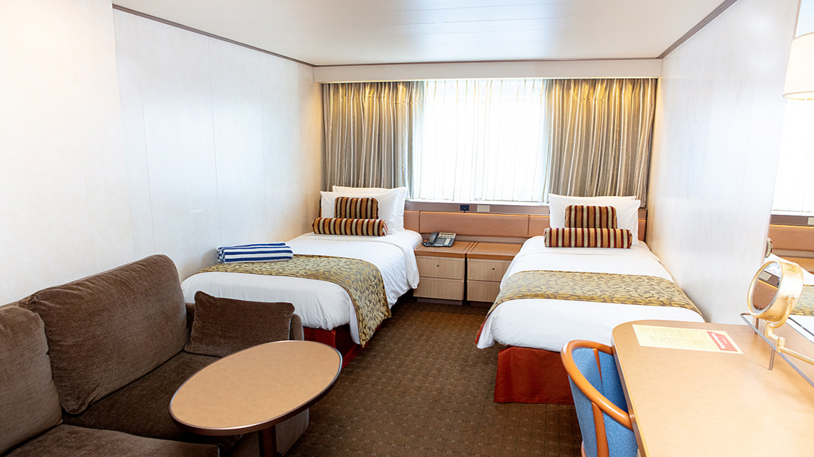 Camarote exterior con ventana. Dispone de dos camas individuales separadas, convertibles en cama doble (en la mayoría de los camarotes), previa solicitud. Algunos camarotes cuentan con sofá-cana individual. Varios camarotes disponen de sofá-cama doble (en vez de dos camas individuales) y litera. Televisor, teléfono y caja fuerte. Cuarto de baño con ducha o bañera y secador de pelo. Tamaño aproximado del camarote: 19m2. Nota: Dentro de la misma categoría de camarote, el tamaño, la disposición y los muebles pueden variar respecto a las imágenes. La imagen se muestra únicamente con fines ilustrativos.19