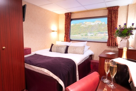 Camarote cómodo con dos camas individuales separados, baño (lavabo, ducha y aseo privados, toallas incluidas), secador, televisión, caja fuerte y radio. Situado en el puente principal con grandes ventanas, ofrece una vista panorámica del paisaje.