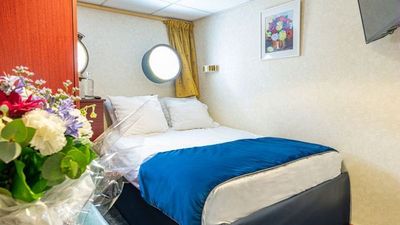 Camarote amplio con ojo de buey que cuenta con cama individual, baño (lavabo, ducha y aseo privados, toallas incluidas), secador, televisión, caja fuerte y radio.