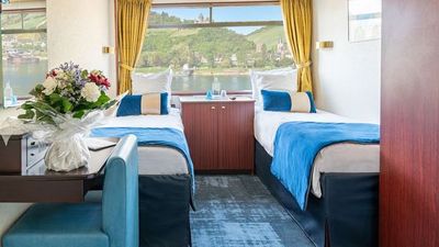 Camarote amplio y cómodo con dos camas individuales, baño (lavabo, ducha y aseo privados, toallas incluidas), secador, televisión, caja fuerte y radio. Situado en el puente principal con grandes ventanas, ofrece una vista panorámica del paisaje.