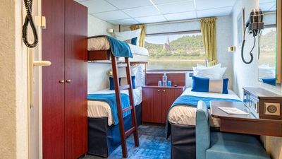 Camarote amplio y cómodo con capacidad para 3 personas (2 camas inferiores y 1 superior), baño (lavabo, ducha y aseo privados, toallas incluidas), secador, televisión, caja fuerte y radio. Situado en el puente principal con grandes ventanas, ofrece una vista panorámica del paisaje.