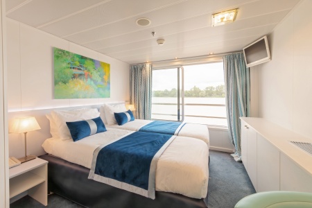 Camarote amplio y cómodo con cama grande, baño (lavabo, ducha y aseo privados, toallas incluidas), secador, televisión, caja fuerte y radio. Situado en el puente superior con balcón francés, ventanas panorámicas correderas, ofrece una vista panorámica del paisaje.