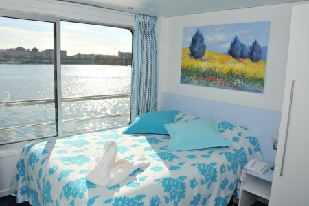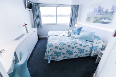 Camarote amplio y cómodo con cama grande separable, baño (lavabo, ducha y aseo privados, toallas incluidas), secador, televisión, caja fuerte y radio. Situado en el puente intermedio con ventanas correderas, ofrece una vista panorámica del paisaje.