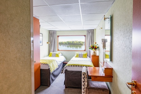 Camarote amplio y cómodo con cama grande separable, baño (lavabo, ducha y aseo privados, toallas incluidas), secador, televisión, caja fuerte y radio. Situado en el puente principal con ventanas altas correderas, ofrece una vista panorámica del paisaje.