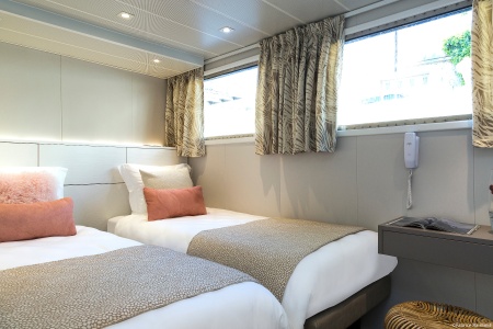 Camarote cómodo con dos camas individuales, baño (lavabo, ducha y aseo privados, toallas incluidas), secador, televisión, caja fuerte y radio. Situado en el puente principal con ventanas altas, ofrece una vista panorámica del paisaje.