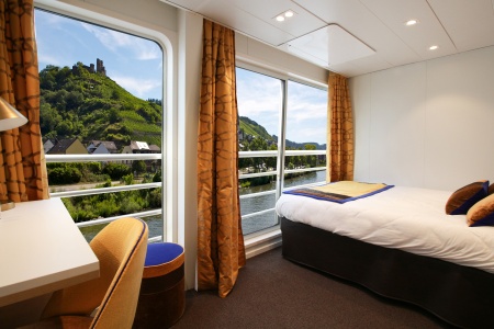 Camarote amplio y cómodo con cama grande separable, baño (lavabo, ducha y aseo privados, toallas incluidas), secador, televisión, caja fuerte y radio. Situado en el puente superior con balcón francés con ventanas panorámicas correderas, ofrece una vista panorámica del paisaje.