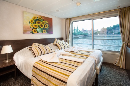 Camarote amplio y cómodo con cama grande separable, baño (lavabo, ducha y aseo privados, toallas incluidas), secador, televisión, caja fuerte y radio. Situado en el puente intermedio con ventanas altas correderas, ofrece una vista panorámica del paisaje.