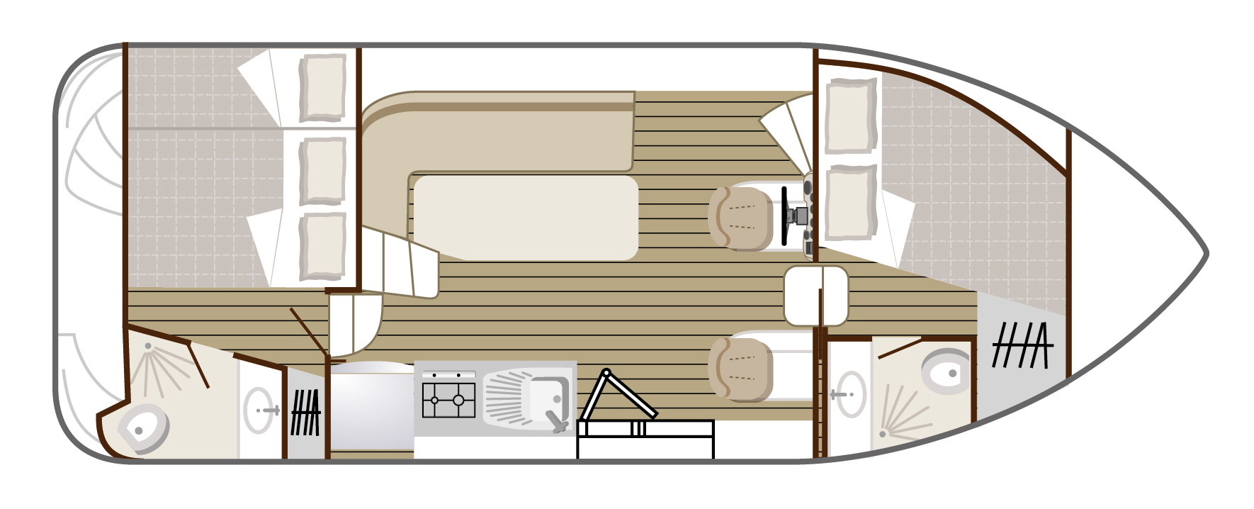 Este modelo destaca dentro del alquiler de barcos sin licencia por su diseño orientado a la privacidad: cuenta con dos cabinas separadas por el salón central, lo que garantiza independencia entre espacios. La cabina principal dispone de cama doble y una cama individual adicional (hasta 3 personas), mientras que la segunda cabina ofrece una cama doble, siendo ideal para dos parejas o familias con niños.