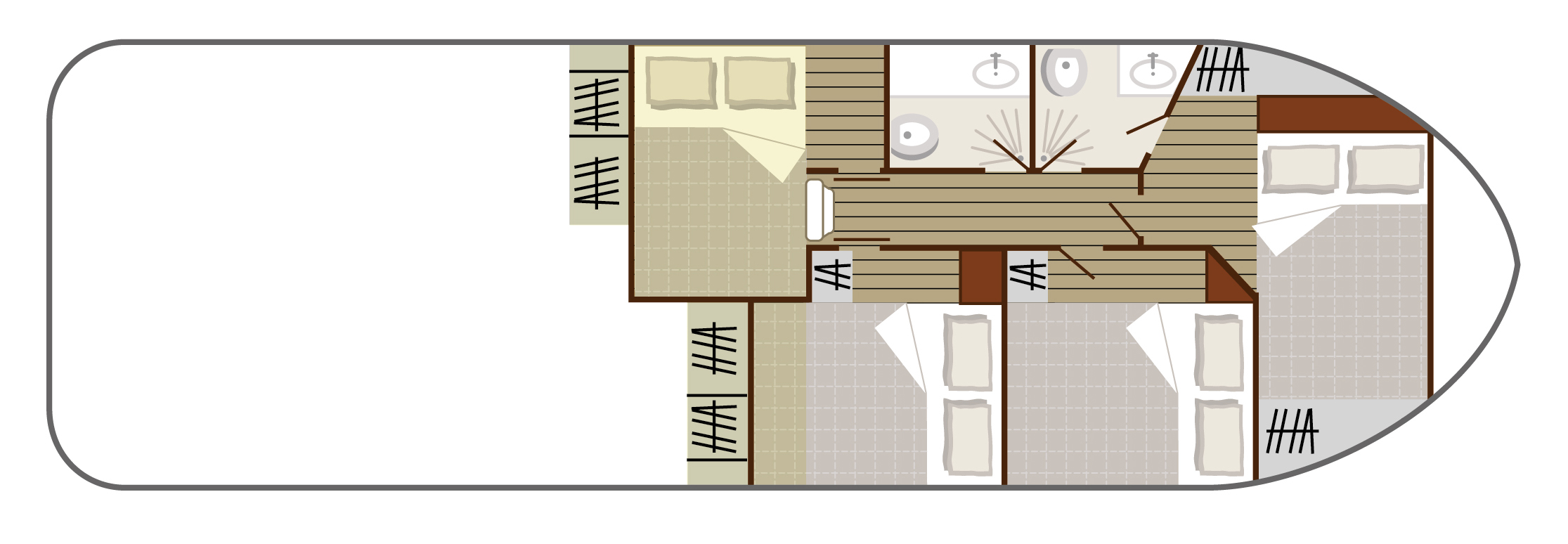 La cocina está completamente equipada con horno, cocina de 3 fuegos, congelador y frigorífico de 220 litros, lo que permite organizar estancias prolongadas con total funcionalidad. Sus cuatro cabinas dobles ofrecen una distribución clara y práctica, consolidándolo como una de las opciones más amplias dentro del alquiler de barcos sin licencia, ideal para disfrutar de los destinos fluviales con confort, independencia y flexibilidad.