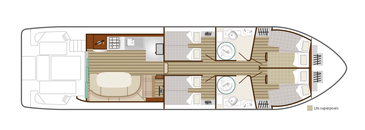 Este modelo está diseñado para quienes quieren alquilar un barco sin licencia con máxima capacidad sin renunciar al confort. Dispone de cuatro cabinas bien distribuidas: dos con cama doble y dos con camas individuales convertibles, lo que permite alojar cómodamente hasta 8-12 personas según configuración. Es una opción muy equilibrada para grupos grandes que buscan convivencia a bordo con espacios funcionales y bien organizados.
