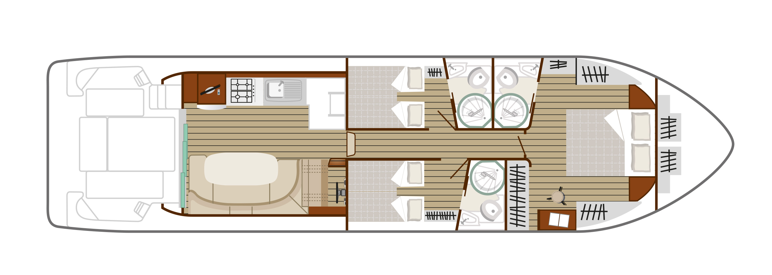 Este modelo destaca dentro del alquiler de barcos sin licencia por su diseño amplio y su equipamiento avanzado. Dispone de tres cabinas en suite, una con cama doble y dos con camas individuales, lo que permite alojar cómodamente hasta 6-8 personas. Su salón central es espacioso y funcional, pensado para la convivencia a bordo durante viajes largos por canales y ríos de Europa.