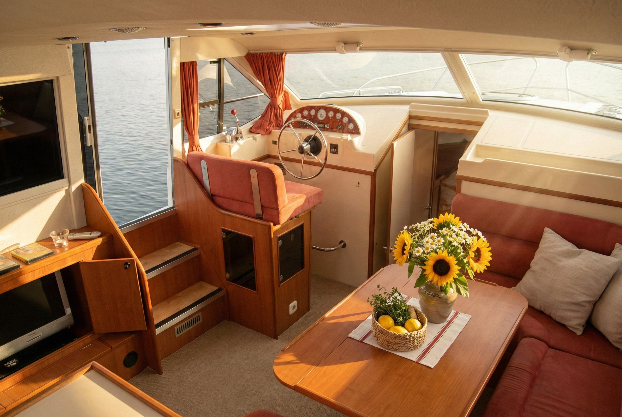 La cocina está equipada con horno, cocina de 3 fuegos, congelador y frigorífico de 165 litros, cubriendo todas las necesidades durante la estancia. Además, incluye toldo exterior (sun shade), perfecto para disfrutar de la cubierta en días soleados. Su combinación de espacio, equipamiento y facilidad de navegación lo posiciona como una excelente opción dentro del turismo fluvial sin licencia en gama Premium.
