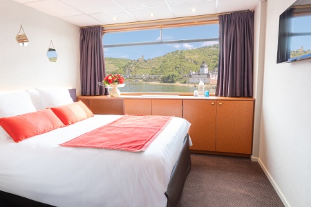 Camarote amplio y cómodo con cama grande, baño (lavabo, ducha y aseo privados, toallas incluidas), secador, televisión, caja fuerte y radio. Situado en el puente intermedio con ventana corredera con ventanas altas correderas, ofrece una vista panorámica del paisaje.
