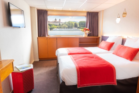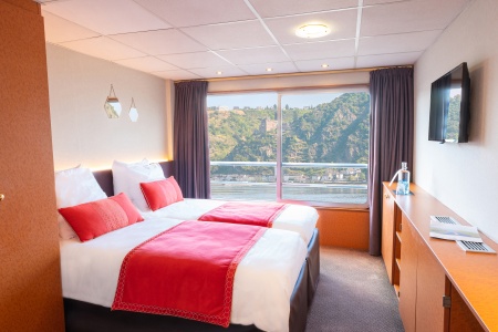 Camarote amplio y cómodo con cama grande separable, baño (lavabo, ducha y aseo privados, toallas incluidas), secador, televisión, caja fuerte y radio. Situado en el puente intermedio con ventana corredera con ventanas altas correderas, ofrece una vista panorámica del paisaje.
