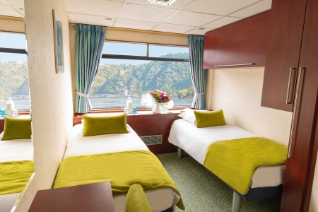 Camarote amplio y cómodo con dos camas individuales, baño (lavabo, ducha y aseo privados, toallas incluidas), secador, televisión, caja fuerte y radio. Situado en el puente principal con grandes ventanas, ofrece una vista panorámica del paisaje.