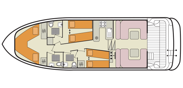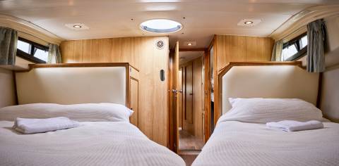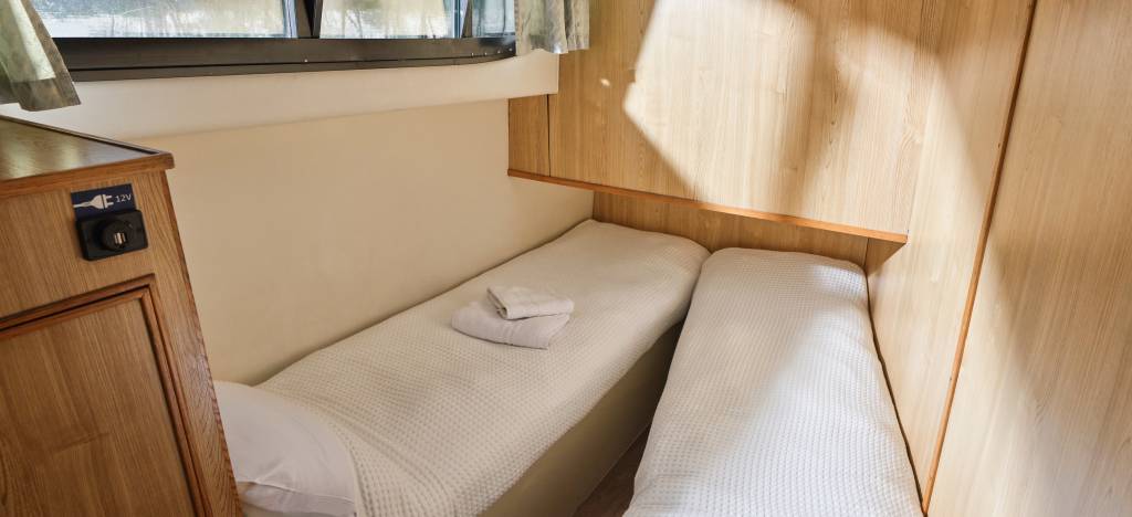 Las cabinas se encuentran en la parte delantera e incluyen cada una dos camas individuales en forma de V que pueden convertirse en cama doble. Junto a las cabinas hay tres baños con ducha, W. C. y lavabo.
