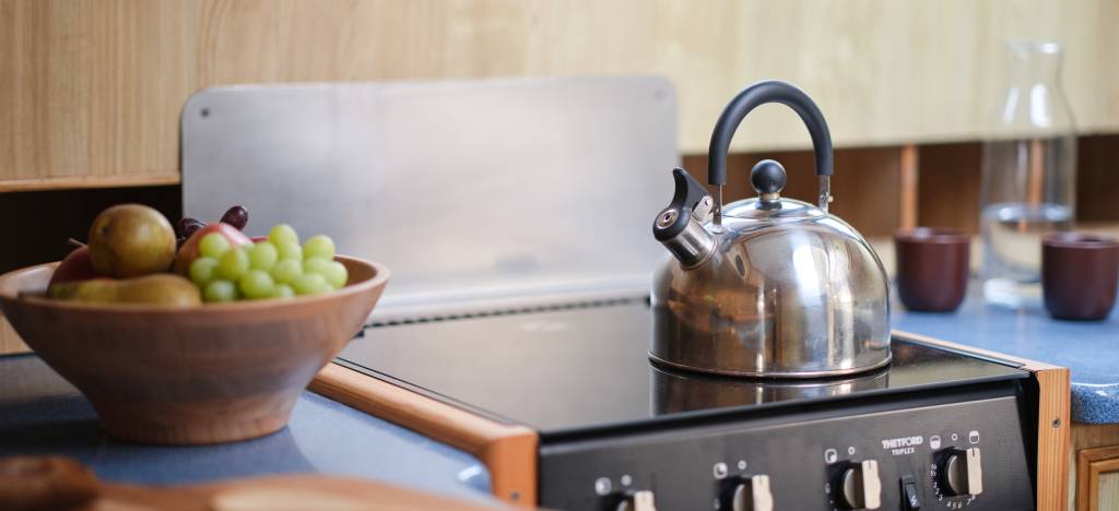 Por la puerta corredera que da a la cubierta de popa entra mucha luz natural. La cocina ultramoderna es amplia y funcional. Cuenta con fogones, un horno pequeño, microondas, nevera eléctrica, fregadero, encimeras grandes y mucho espacio de almacenamiento en los armarios.