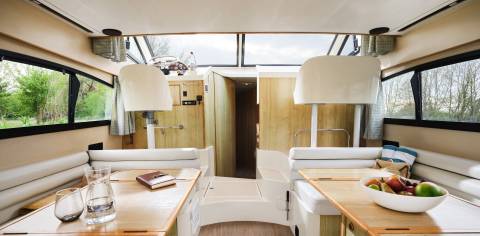 La cubierta superior del barco Elegance es amplia y dispone de sofás comodos. Cuenta con un segundo puesto de mando. La navegación es sencilla gracias al propulsor de proa.