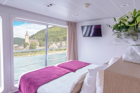 Camarote amplio y cómodo con cama grande separable, baño (lavabo, ducha y aseo privados, toallas incluidas), secador, televisión, caja fuerte y radio. Situado en el puente superior con grandes ventanas panorámicas correderas, ofrece una vista panorámica del paisaje.