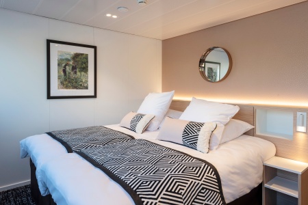 Suite amplia y cómoda con dos camas individuales, baño (lavabo, ducha y aseo privados, toallas incluidas), secador, televisión, caja fuerte y radio. Situada en el puente principal con grandes ventanas, ofrece una vista panorámica del paisaje.