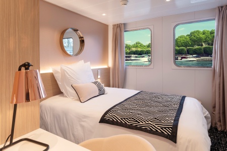 Camarote amplio y cómodo con cama grande separable, baño (lavabo, ducha y aseo privados, toallas incluidas), secador, televisión, caja fuerte y radio. Situado en el puente principal con grandes ventanas, ofrece una vista panorámica del paisaje.