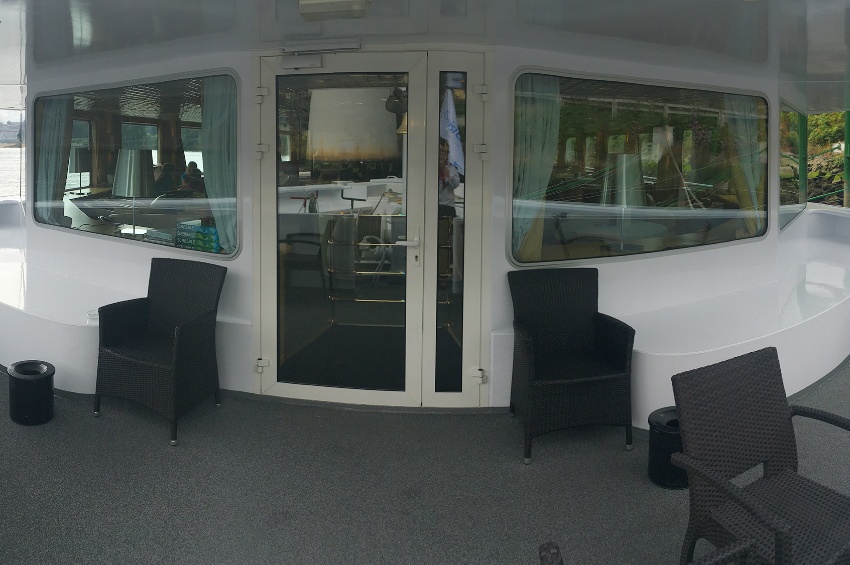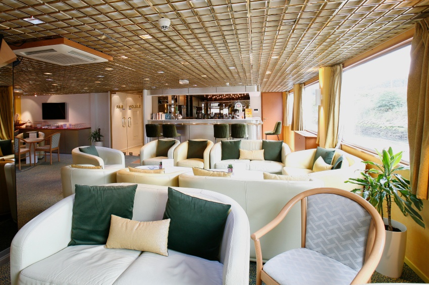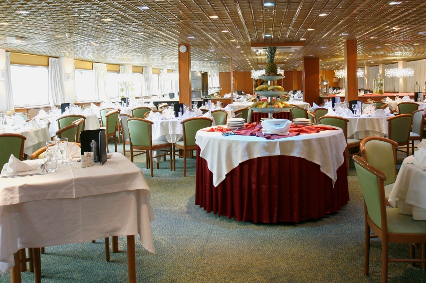 Situado en la cubierta principal, el restaurante, donde se sirven todas las comidas durante el viaje, ofrece una cocina delicada en un entorno refinado, donde grandes ventanales le permite disfrutar plenamente de las vistas. En la cubierta intermedia se encuentra el lounge bar con pista de baile. Una piscina completa el puente sol, donde hay además una gran zona sombreada con cómodas tumbonas para relajarse.