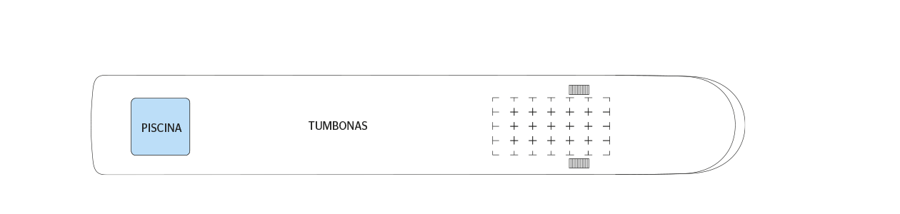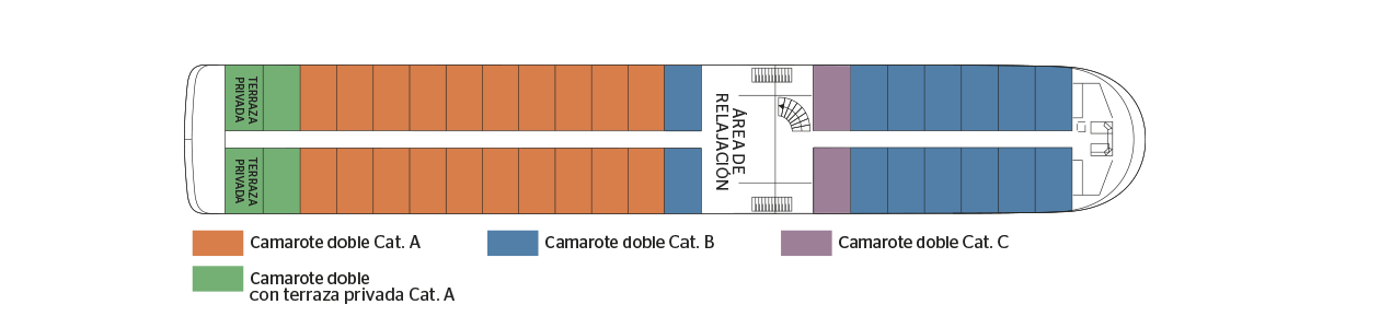 Camarote amplio y cómodo con cama grande separable, baño (lavabo, ducha y aseo privados, toallas incluidas), secador, televisión, caja fuerte y radio. Situado en el puente intermedio con ventanas altas correderas, ofrece una vista panorámica del paisaje.PUENTE SUPERIOR