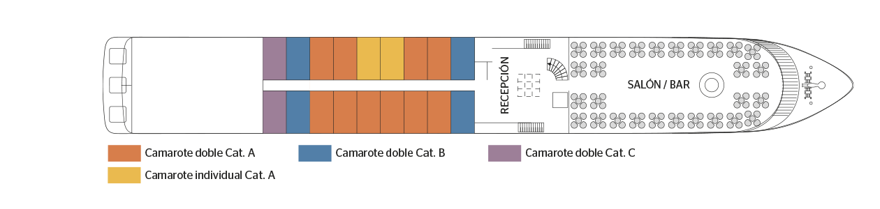 Camarote amplio y cómodo con cama grande separable, baño (lavabo, ducha y aseo privados, toallas incluidas), secador, televisión, caja fuerte y radio. Situado en el puente principal con ventanas, ofrece una vista panorámica del paisaje.PUENTE INTERMEDIO