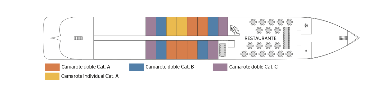 Camarote amplio y cómodo con cama grande separable, baño (lavabo, ducha y aseo privados, toallas incluidas), secador, televisión, caja fuerte y radio. Situado en el puente superior con grandes ventanas altas correderas, ofrece una vista panorámica del paisaje.Áreas comunes del barco
