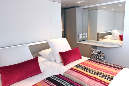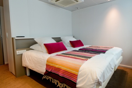Camarote amplio y cómodo con cama grande separable, baño (lavabo, ducha y aseo privados, toallas incluidas), secador, televisión, caja fuerte y radio. Situado en el puente principal con ventanas pequeñas, ofrece una vista panorámica del paisaje.