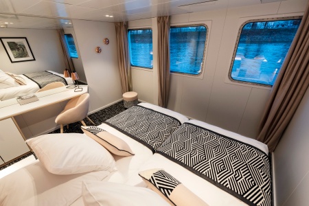 Camarote cómodo con cama grande separable, baño (lavabo, ducha y aseo privados, toallas incluidas), secador, televisión, caja fuerte y radio. Situado en el puente principal, ofrece una vista panorámica del paisaje.