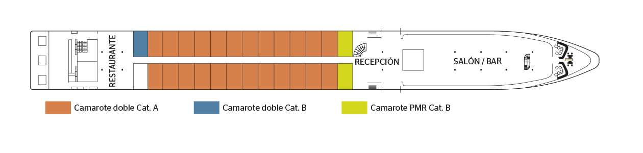 Camarote amplio y cómodo con cama grande separable, baño (lavabo, ducha y aseo privados, toallas incluidas), secador, televisión, caja fuerte y radio. Situado en el puente principal con ventanas altas, ofrece una vista panorámica del paisaje.11.00