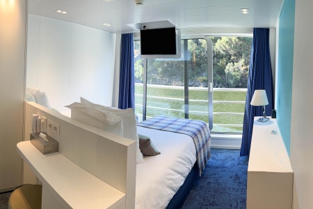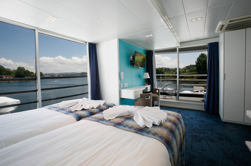 Camarote amplio y cómodo con balcón francés y ventanal corredero, cama grande separable, baño (lavabo, ducha y aseo privados, toallas incluidas), secador, televisión, caja fuerte y radio. Situado en el puente superior con balcón francés, ventanas panorámicas correderas, ofrece una vista panorámica del paisaje.Áreas comunes del barco