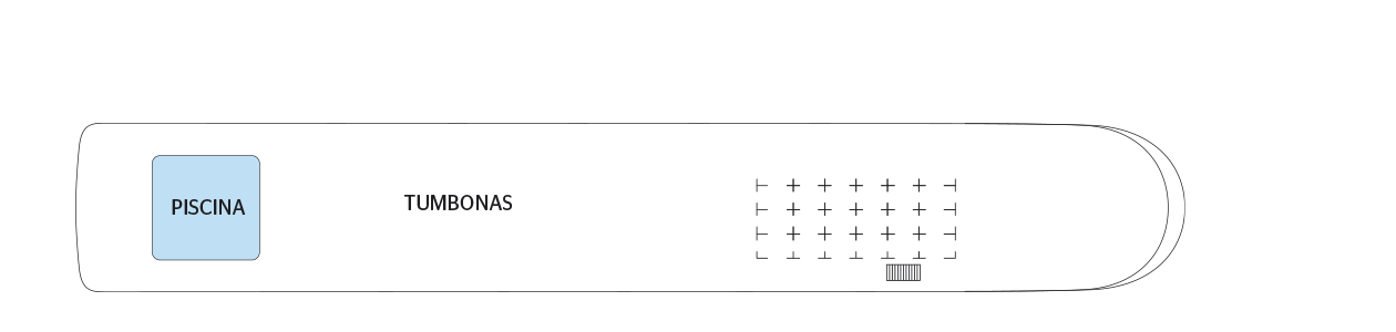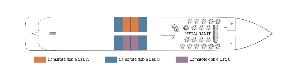 Camarote amplio y cómodo con cama grande separable, baño (lavabo, ducha y aseo privados, toallas incluidas), secador, televisión, caja fuerte y radio. Situado en el puente principal, ofrece una vista panorámica del paisaje.PUENTE INTERMEDIO