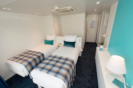 Camarote amplio y cómodo con cama grande separable, baño (lavabo, ducha y aseo privados, toallas incluidas), secador, televisión, caja fuerte y radio. Situado en el puente principal, ofrece una vista panorámica del paisaje.PUENTE PRINCIPAL 2 CAMAS SEPARABLES CAT B