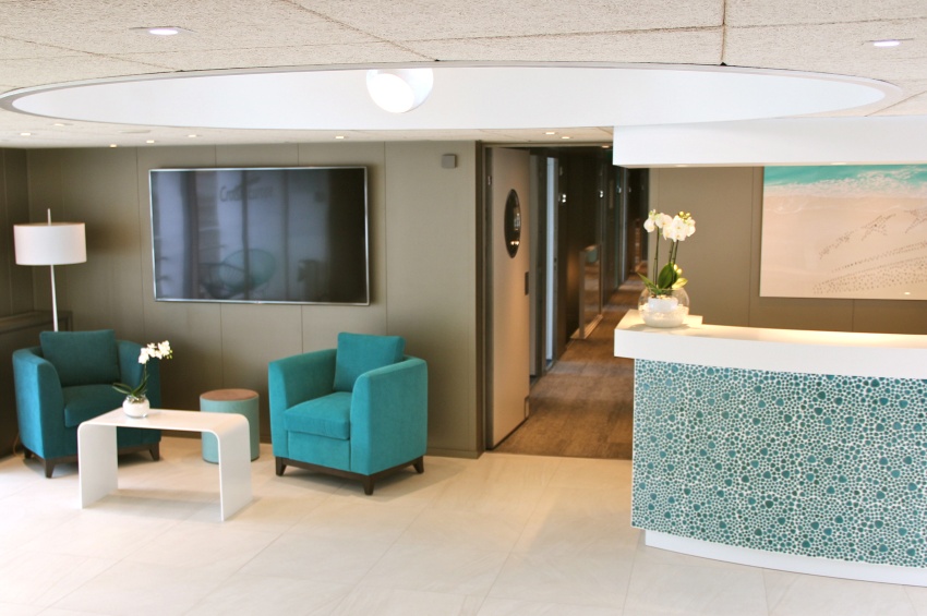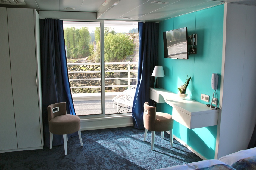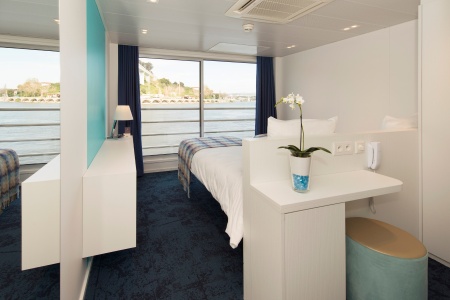 Los elegantes topo, bronce y blanco se mezclan maravillosamente con el turquesa que evoca a los azulejos. Los camarotes en los puentes superior e intermedio tienen grandes ventanales con balcones franceses. 4 suites se reparten entre estos dos puentes, 2 de ellas ubicadas en el puente superior superior disponen de tumbonas.