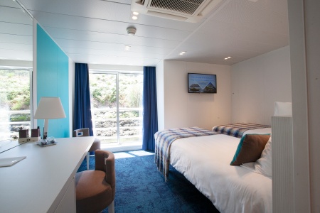 Camarote amplio y cómodo con balcón francés y ventanal corredero, cama grande separable, baño (lavabo, ducha y aseo privados, toallas incluidas), secador, televisión, caja fuerte y radio. Situado en el puente intermedio con balcón francés, ventanas panorámicas correderas, ofrece una vista panorámica del paisaje.PUENTE INTERMEDIO 2 CAMAS SEPARABLES CAT B