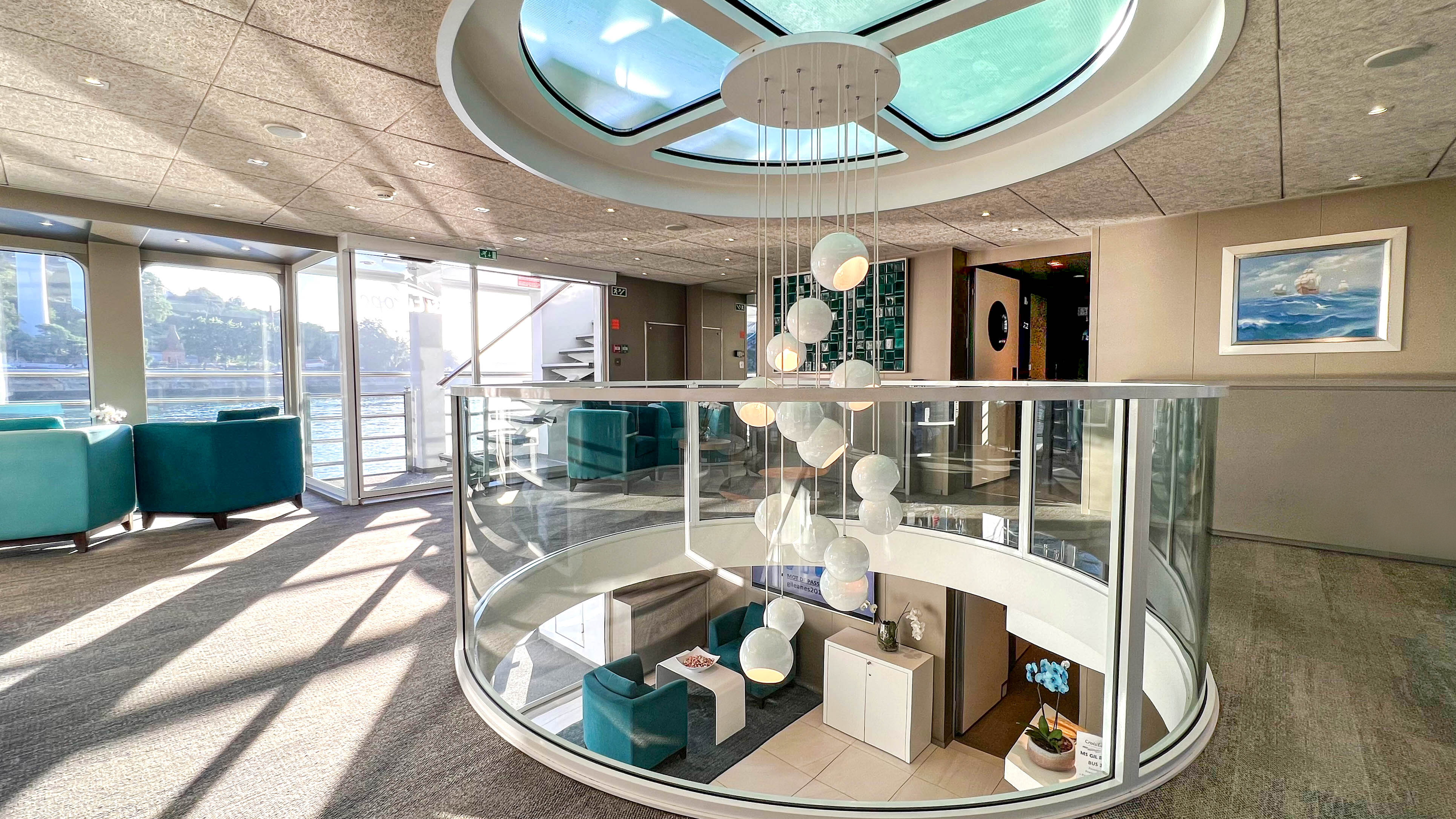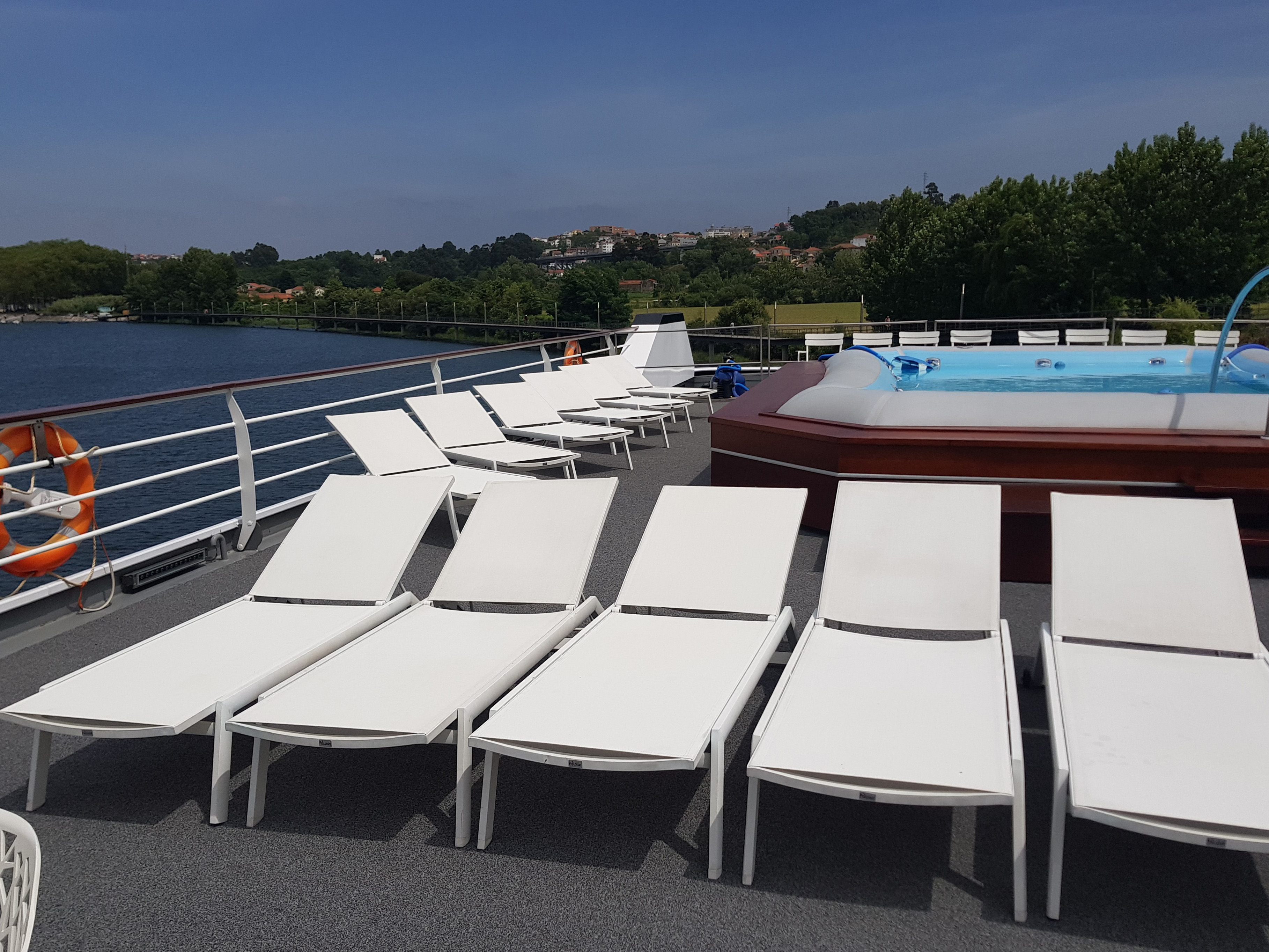 En el puente principal, las grandes ventanas invitan a disfrutar del paisaje desde la comodidad de los camarotes. Ubicado en el puente principal, el restaurante es el lugar donde se sirven todas las comidas durante el crucero. El salón / bar está ubicado en la parte delantera del puente intermedio y acogerá a los pasajeros durante las tardes animadas y juegos, y también tiene una terraza en la zona delantera. Para momentos de relajación, el puente sol está equipado con una piscina rodeada de tumbonas.