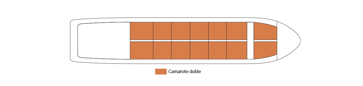 Cabina espaciosa y confortable con grandes ventanas con vista a los pasillos externos. Diseñado con un amplio espacio de almacenamiento, tiene dos camas bajas que se pueden juntar, un baño (lavabo, ducha y baño privado, albornoces), secador de pelo, tocador, caja fuerte y aire acondicionado. Situado en la cubierta superior con grandes ventanas y dan a pasillos exteriore, ofrece una vista panorámica de los paisajes.Áreas comunes del barco