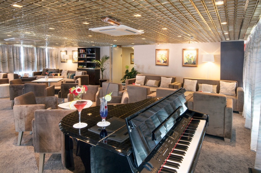 El salón, amueblado con gusto y elegancia, se encuentra en la parte delantera del barco y ofrece una vista panorámica. Los aperitivos, las noches de baile y otras animaciones tienen lugar allí.