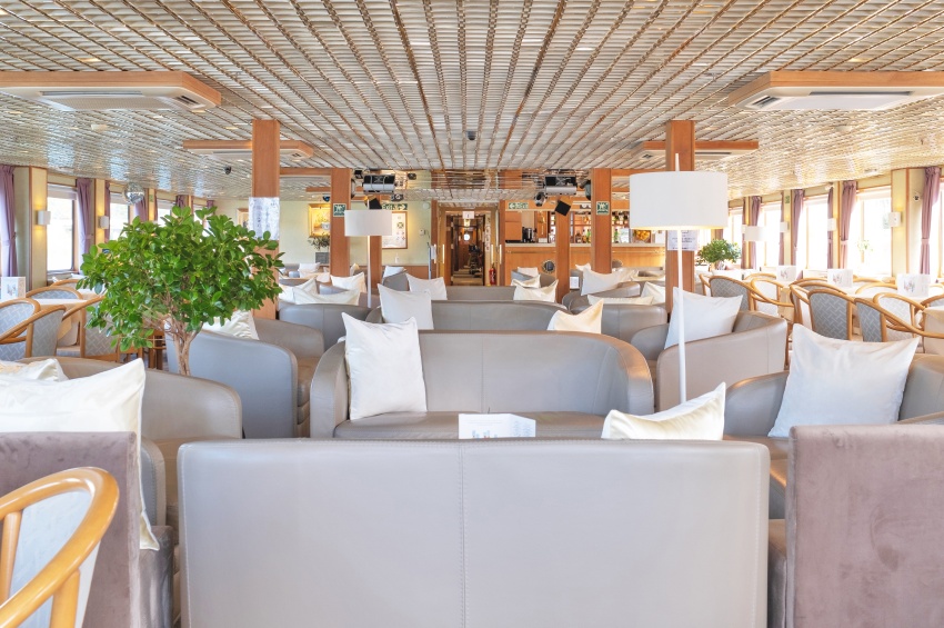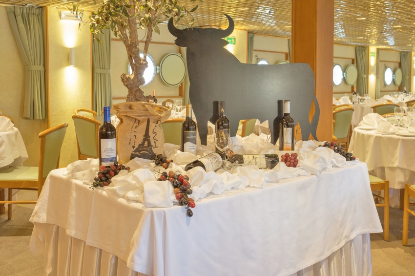 Ubicado en el puente principal, el restaurante es el lugar donde se sirven todas las comidas durante el crucero. En el puente intermedio, el salón / bar es el lugar donde tienen lugar veladas animadas y juegos. En la zona de popa del barco en el puente superior, el pianorama bar también está a disposición para durante el momento del aperitivo como por la noche, antes o después de la cena.