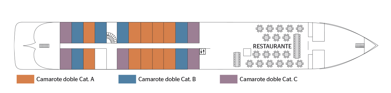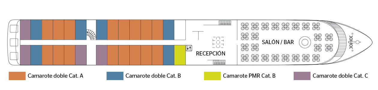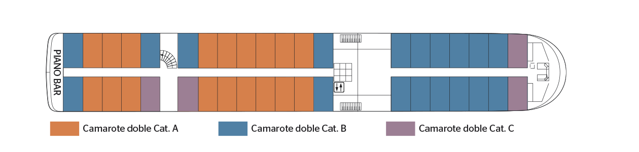 Camarote amplio y cómodo con cama grande separable, baño (lavabo, ducha y aseo privados, toallas incluidas), secador, televisión, caja fuerte y radio. Situado en el puente intermedio con ventanas de apertura superior, ofrece una vista panorámica del paisaje.PUENTE SUPERIOR